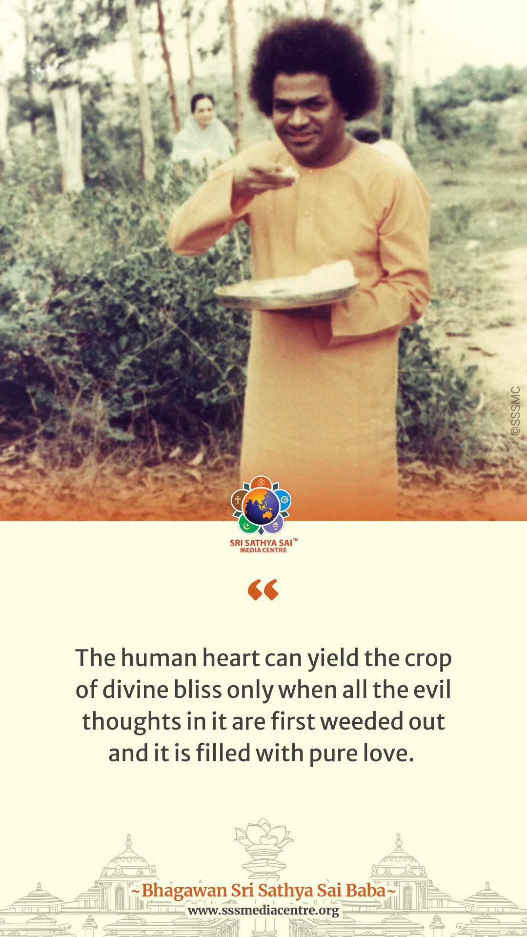 The human heart can yield the crop of divine bliss only when all the evil thoughts in it are first weeded out and it is filled with pure love. – BABA