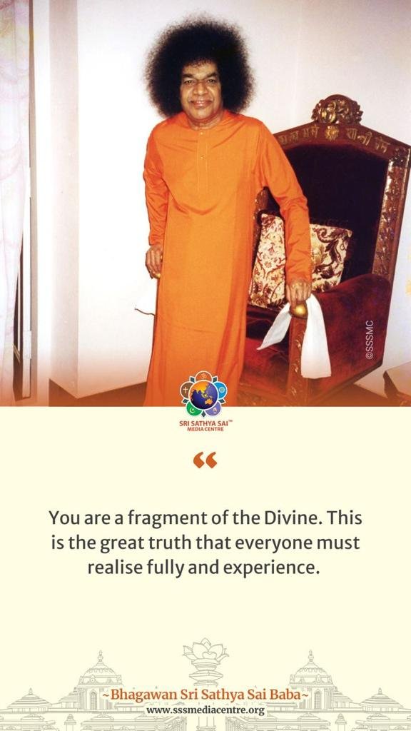 You are a fragment of the Divine. This is the great truth that everyone must realise fully and experience. – BABA