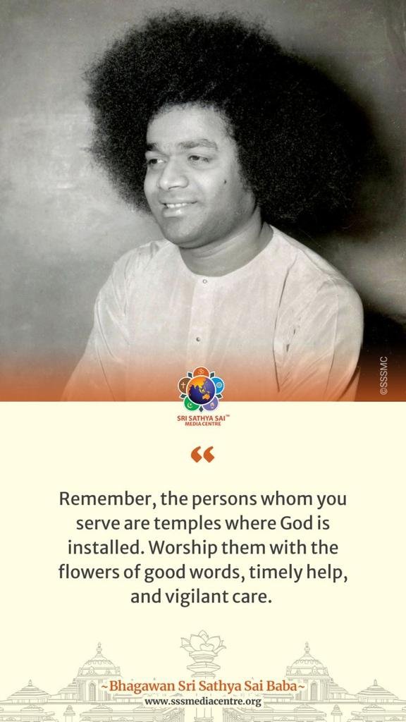 Remember, the persons whom you serve are temples where God is installed. Worship them with the flowers of good words, timely help, and vigilant care. – BABA