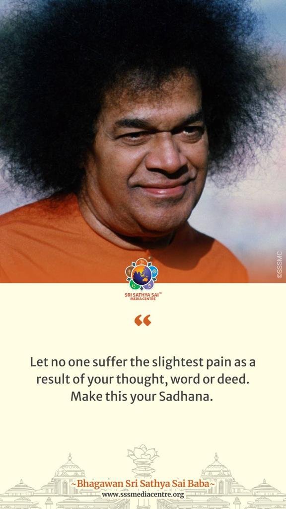 Let no one suffer the slightest pain as a result of your thought, word or deed. Make this your Sadhana. – BABA