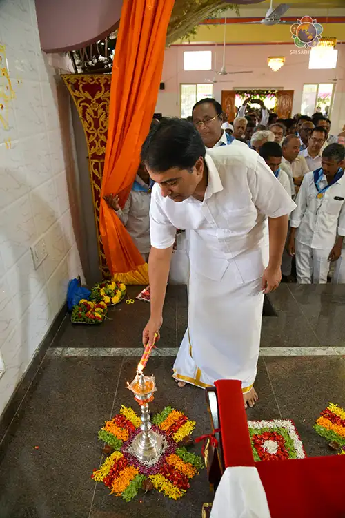 Dignitaries from Sri Sathya Sai Global Council member countries like Malaysia, Taiwan, Singapore, Indonesia, Sri Lanka, Nepal etc. who have come for Buddha Poornima Celebrations also took part in the proceedings by distributing Amrutha Kalashas and arranging for Narayana Seva for all the devotees gathered there.