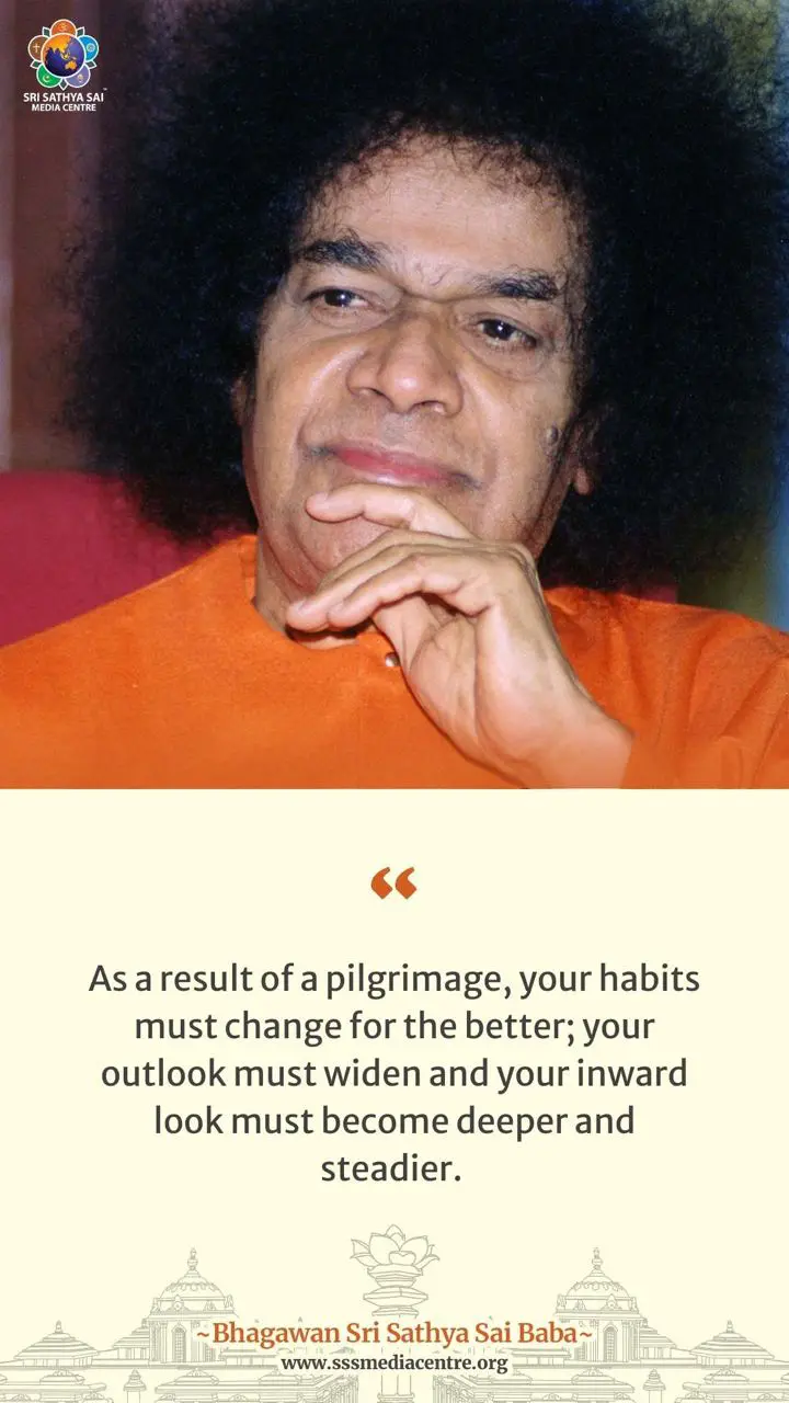 When you reach a holy place, entertain only holy thoughts. On seeing a doctor, you remember your illness; when you see a lawyer, you wish to consult him on some problem of property or personal spite; when you see a temple, you are reminded of the Force that animates the Universe. Your travel should be not for amusement but for using your discrimination (not vinoda-prayana but viveka-prayana). Do not use such pilgrimages for going on picnics; do not seek to purchase vessels and clothes and rarities in the shops of the towns you visit; pay attention more to the need for filling your minds with holy experiences over which you can ruminate after returning to the quiet of your home. When you are in a holy place (kshetra), think of the divine dweller of the place (Kshetrajna). Again, do not get involved with the bad traits that may be found in the places to which you go. Seek the company of the good, and move in the midst of the sacred and the sanctifying. That is what you came so far for.