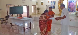 The training programme included veda practice, omkaram, slokas, prayers, jyothi meditation, bhaja govindam, assingment review and feedback and a question & answer session. Further a question & answer formular was also issued as teaching materials for group 1, group 2 & group 3. Also, CDs containing slokas and prayers were issued to the Teachers.