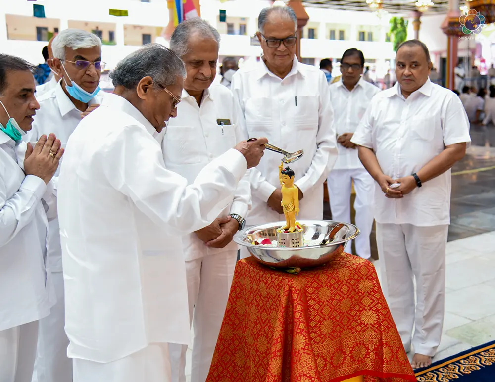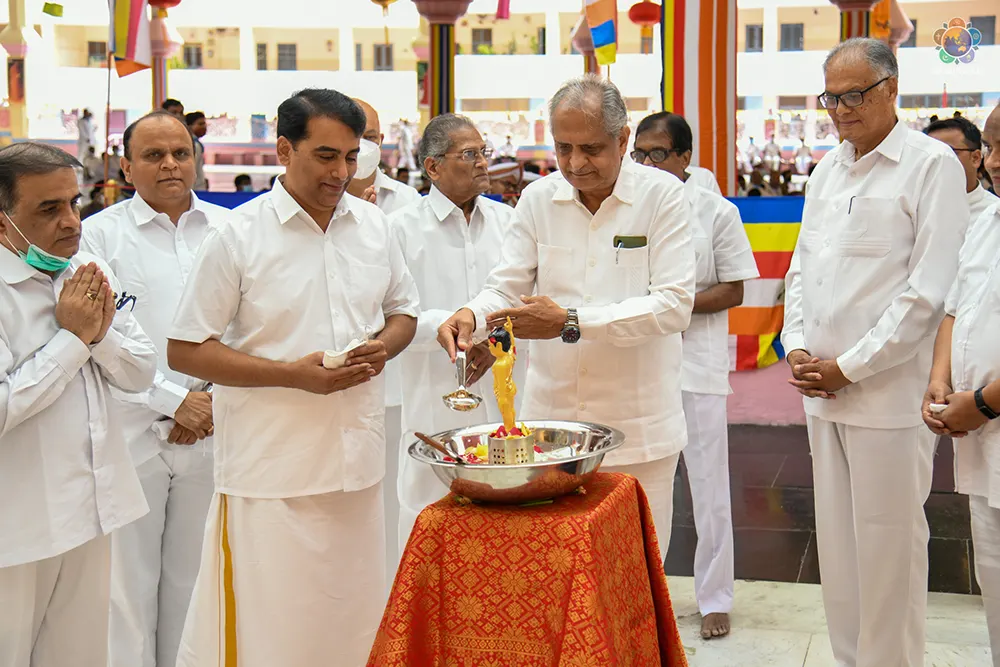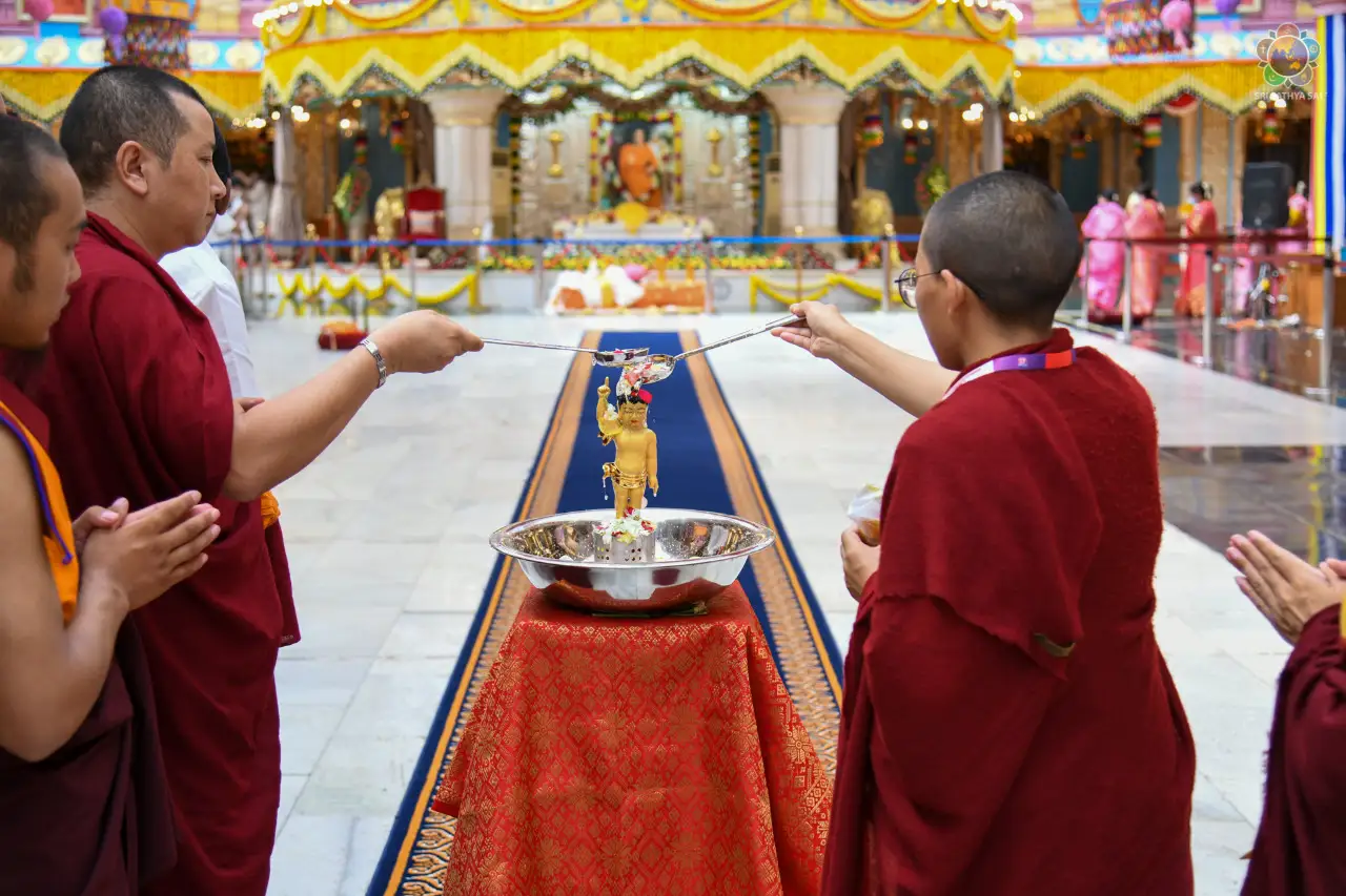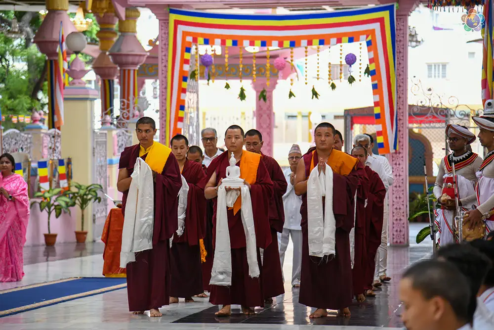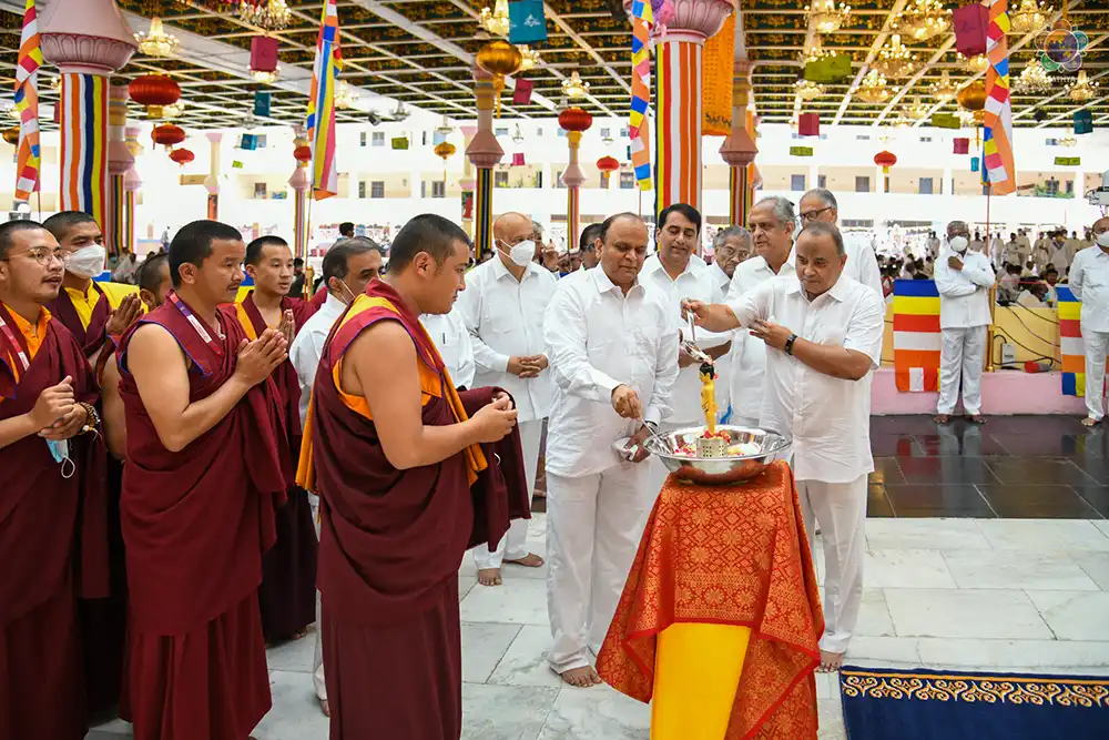 It was heartening to see 15 monks from Kathmandu initiating the proceedings in the morning by walking in a procession amidst traditional hymns of Narasiha Gatha. The monks then placed a White Buddha Statue at the Divine Sannidhi and invited all the revered elders to light the traditional lamp.