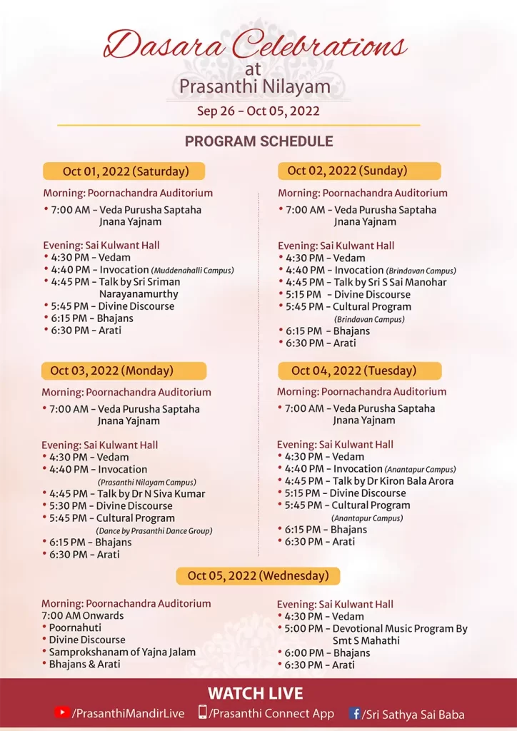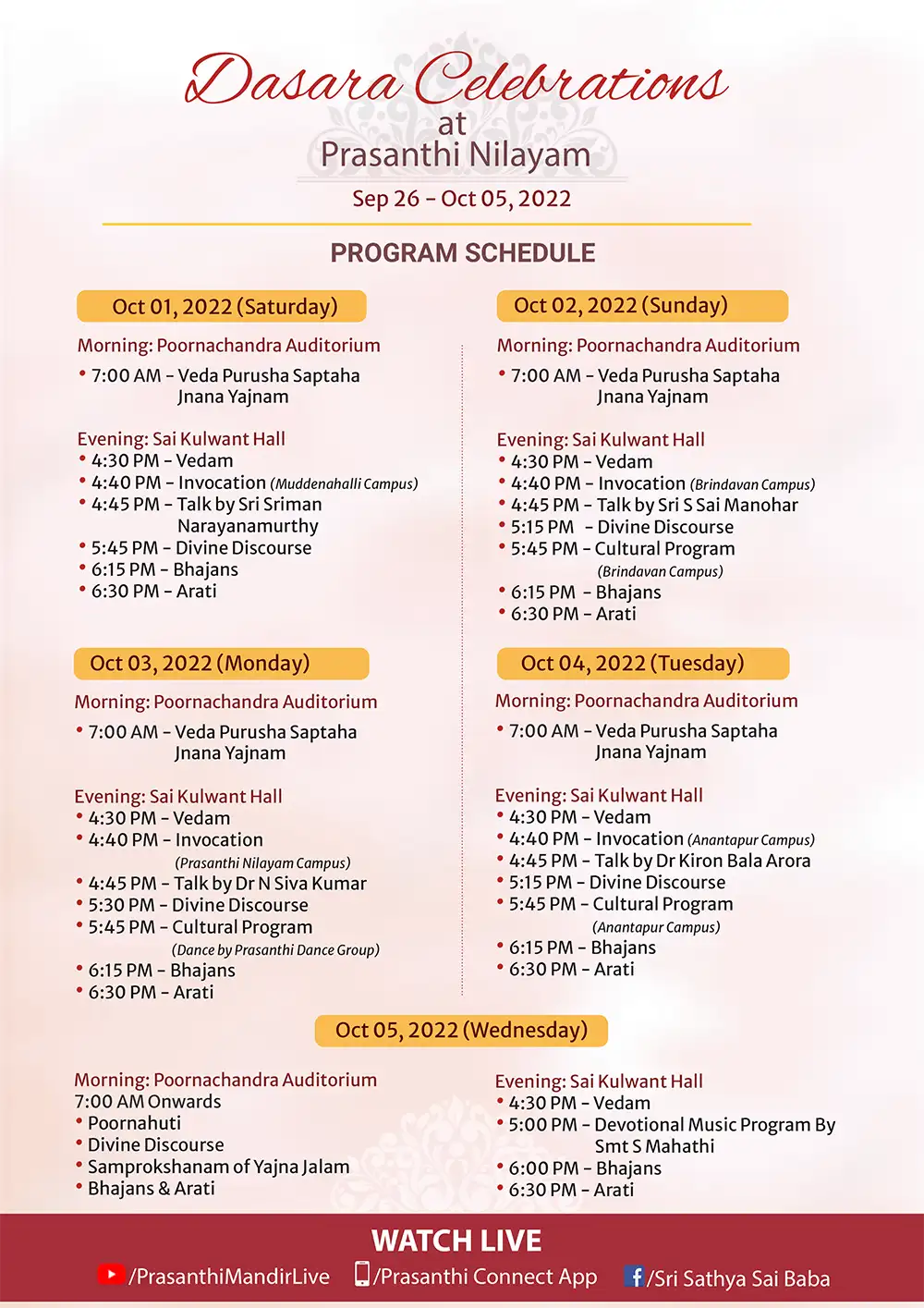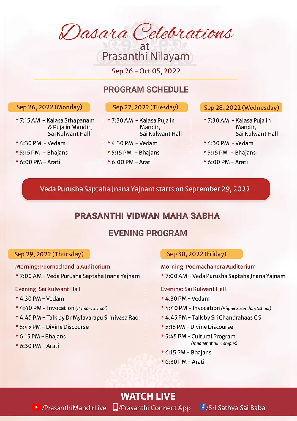 With the Divine Blessings of our beloved Bhagawan, Dasara Festival would be celebrated with devotional fervour at Prasanthi Nilayam from Sep 26 to Oct 05, 2022.