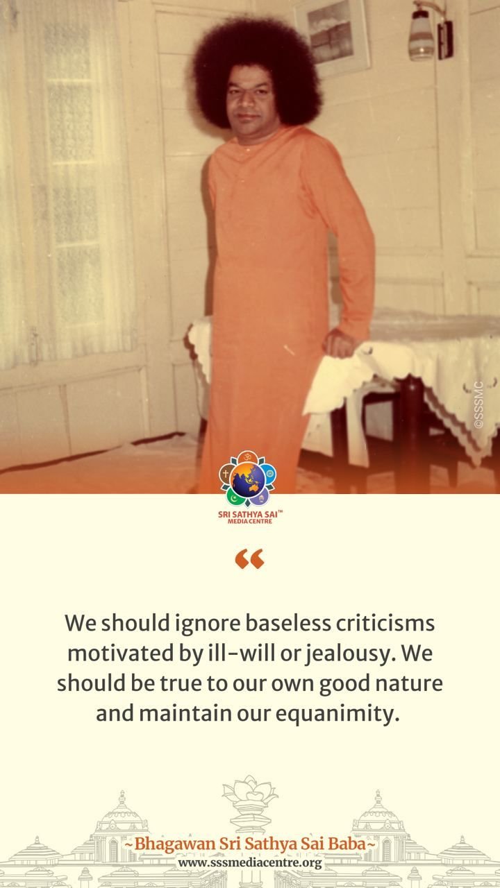 We should ignore baseless criticisms motivated by ill-will or jealousy. We should be true to our own good nature and maintain our equanimity. – BABA