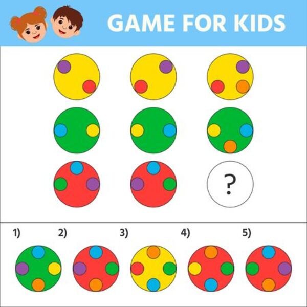 Judgment game: Good for kids five to ten years old. Ask the child to select the most appropriate figure to fill the empty circle out of the five figures shown below. Once a figure is chosen, ask the student the reason (s) why the choice is appropriate.
