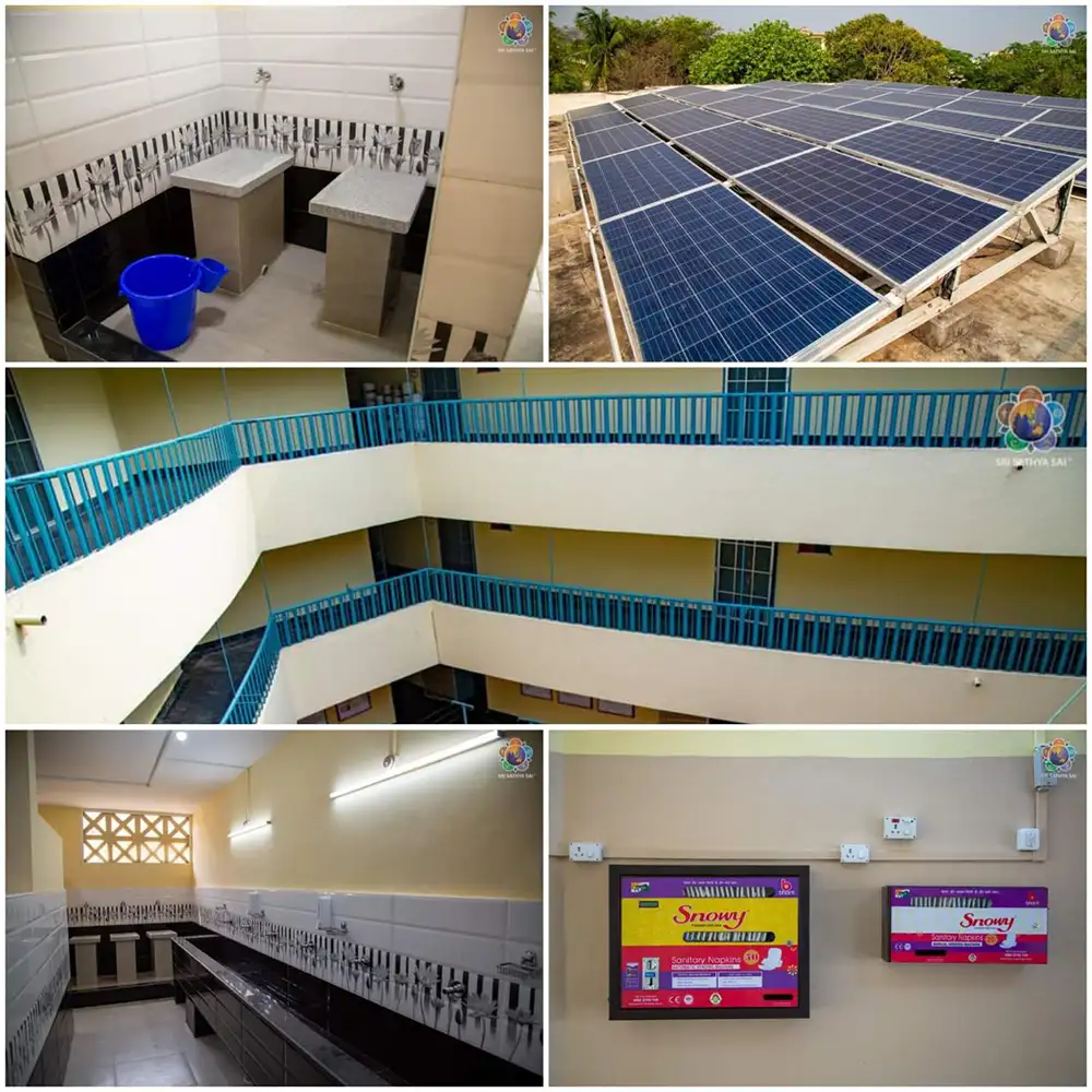 The Sri Sathya Sai Central Trust, in their continued efforts to provide the best facilities for all the devotees worldwide, has taken yet another step in refurbishing the Ladies Sevadal Block. The dorms are renovated with spacious windows fitted with mosquito nets and new curtains, new fans and extra charging points. New inverter bulbs/tube-lights have been fitted to ensure lighting in event of power outages. The entire building is now powered with Solar Energy. Nearly 100 – 140 lockers have been provided for the members. A new PA system for announcements/information has also been fitted. The bathrooms/toilets have been completely renovated with anti skid tiles along with provision for hot water and washing stones. Automatic and manual sanitary napkins vending machine have been installed.