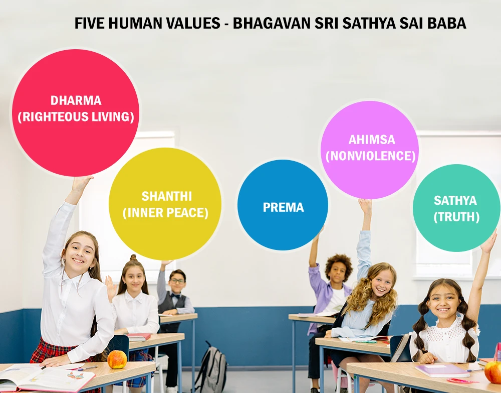 Let us learn the Five Human Values Bhagavan Sri Sathya Sai Baba has expounded and their significance to the human society. The Five Human Values expounded by Bhagavan Sri Sathya Sai Baba, that have become the foundation of Sathya Sai Education are: Sathya (Truth), Dharma (Righteous living), Shanthi (Inner Peace), Prema, and Ahimsa (Nonviolence)