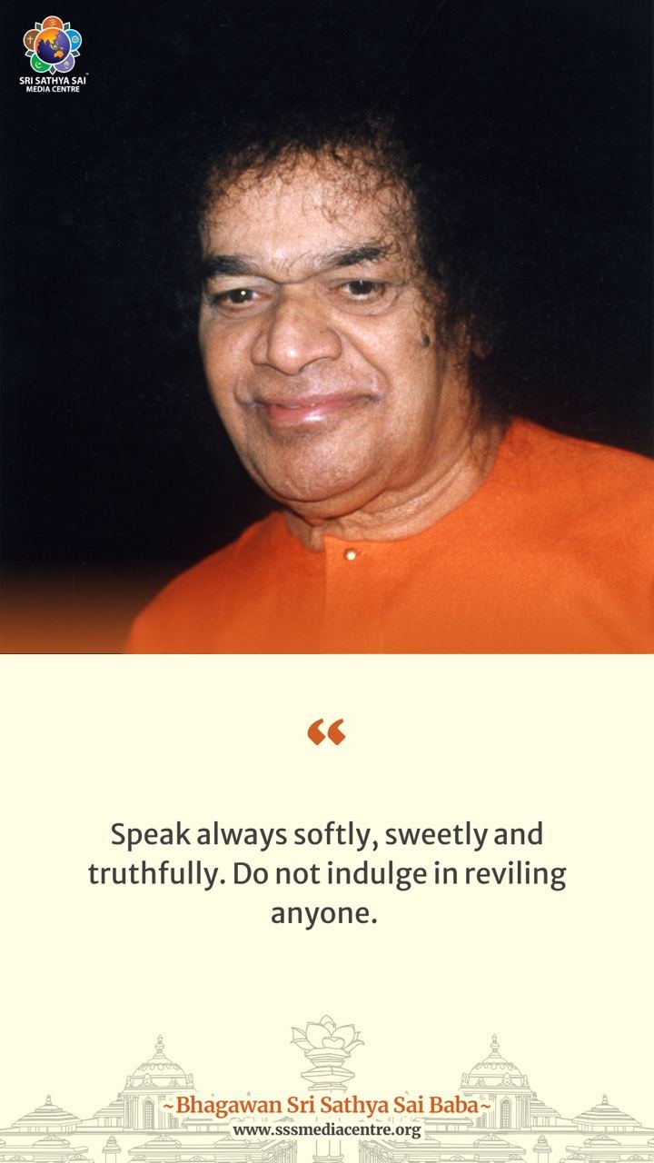Through the power of Vak (speech) one can acquire a kingdom or great wealth. Friends and relations can be got through speech. Through speech, one gets bound and loses his freedom. Even death is brought about by speech. Speech is the life-force of human beings. Speech is the backbone of life. It is all-powerful. Saint Jayadeva addressed his tongue thus: “Oh tongue! You know all about the sweetness of speech! You enjoy truth and goodness. That is why chant the sweet and sacred names of the Lord – Govinda! Damodara! Madhava! Don’t indulge in reviling anyone. Speak sweetly and softly”. “Let your speech be truthful, pleasing, good and free from any resentment,” says Krishna in the Gita. Unfortunately, because such sacred and sweet speech has become scarce, society is riddled with bitterness and discord. The permissiveness of a crazy civilization has destroyed discipline and morality, and turned society into an inferno.