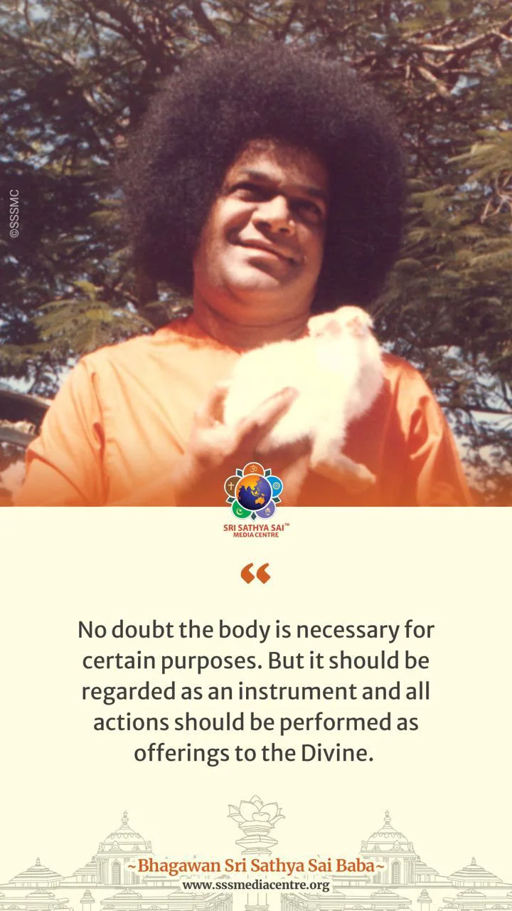 No doubt the body is necessary for certain purposes. But it should be regarded as an instrument and all actions should be performed as offerings to the Divine. – BABA