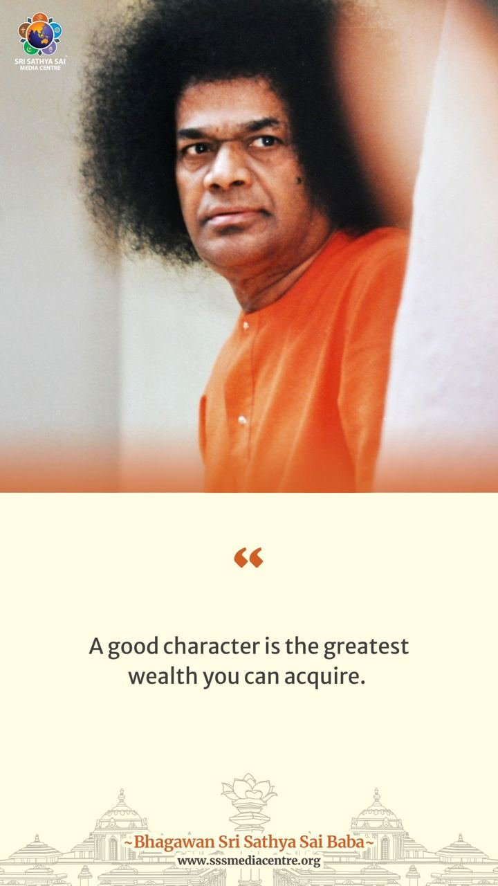 Your nature is revealed by your acts, gestures, looks, speech, your food habits, dress, and gait! Therefore, pay attention to ensure that your speech, your movements, thoughts, and behaviour are all right — full of love, pure, and devoid of wildness and waywardness! You must develop the humility to believe that you have much good to learn from others! Your enthusiasm, your strong ambition, resolution, capacity to work, your store of knowledge, and wisdom — these must be related to all others and not utilised for you alone! Your heart should take all others in. Your thoughts too should be patterned on those broad lines. Treat each trouble you encounter as a fortunate opportunity to develop your strength of mind and to toughen you with greater fortitude. Eating food is a holy ritual (yajna). It should not be performed during moments of anxiety or emotional tension. Food must be considered as medicine for the illness of hunger and as the sustenance of life.