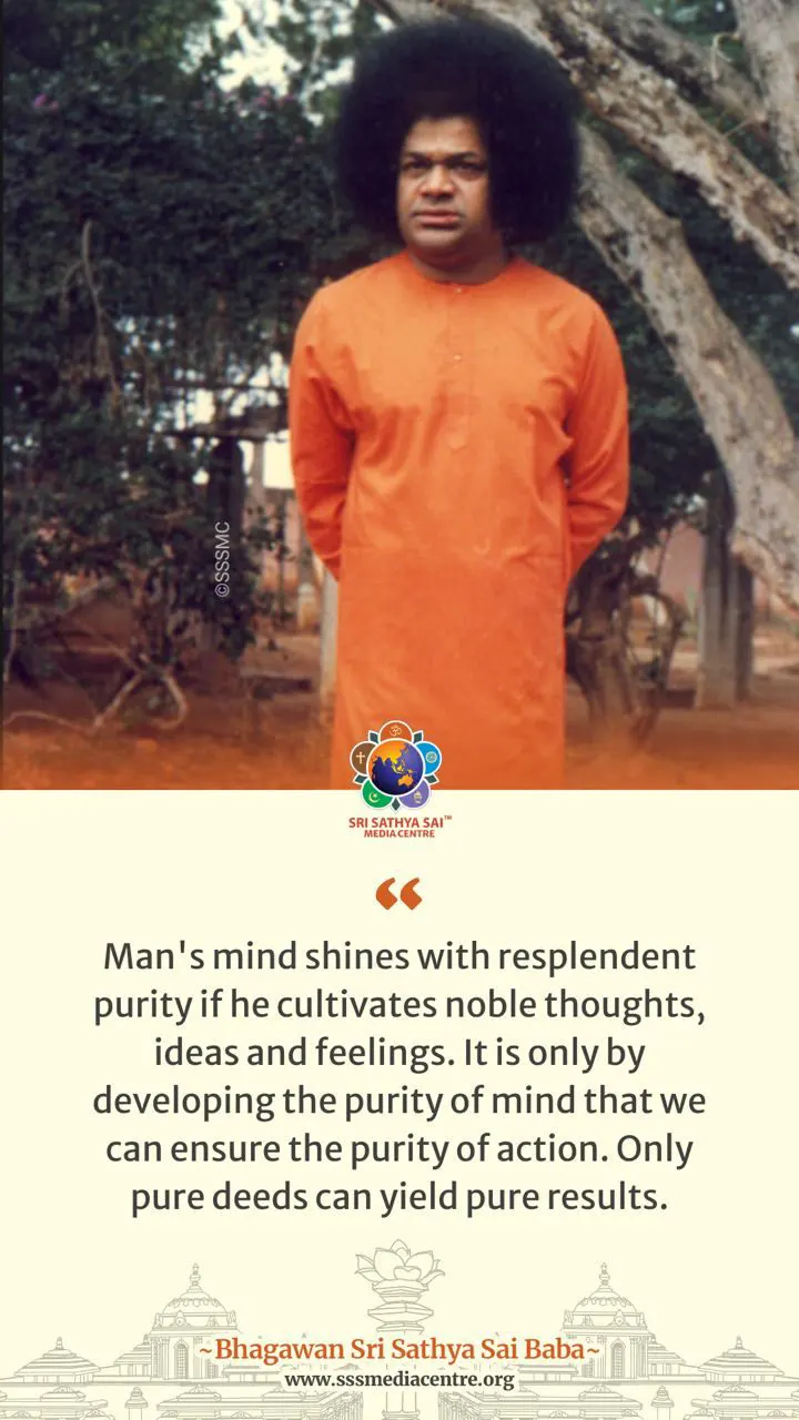 Man’s mind shines with resplendent purity if he cultivates noble thoughts, ideas and feelings. It is only by developing the purity of mind that we can ensure the purity of action. Only pure deeds can yield pure results. – BABA