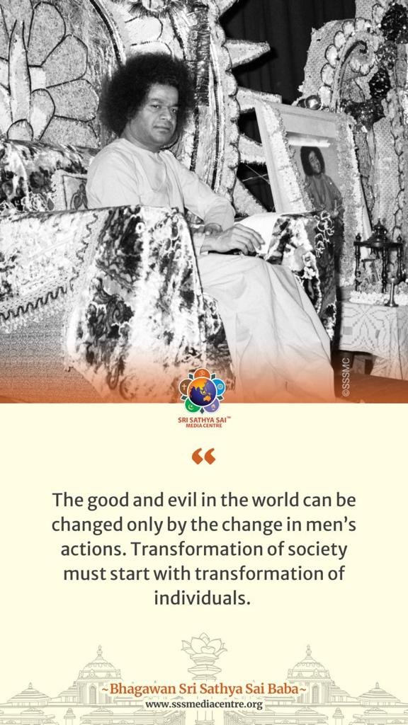 The good and evil in the world can be changed only by the change in men’s actions. Transformation of society must start with transformation of individuals. – BABA