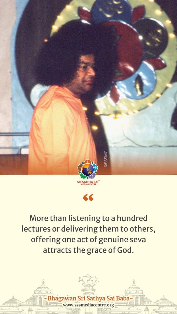 More than listening to a hundred lectures or delivering them to others, offering one act of genuine seva attracts the grace of God. – BABA