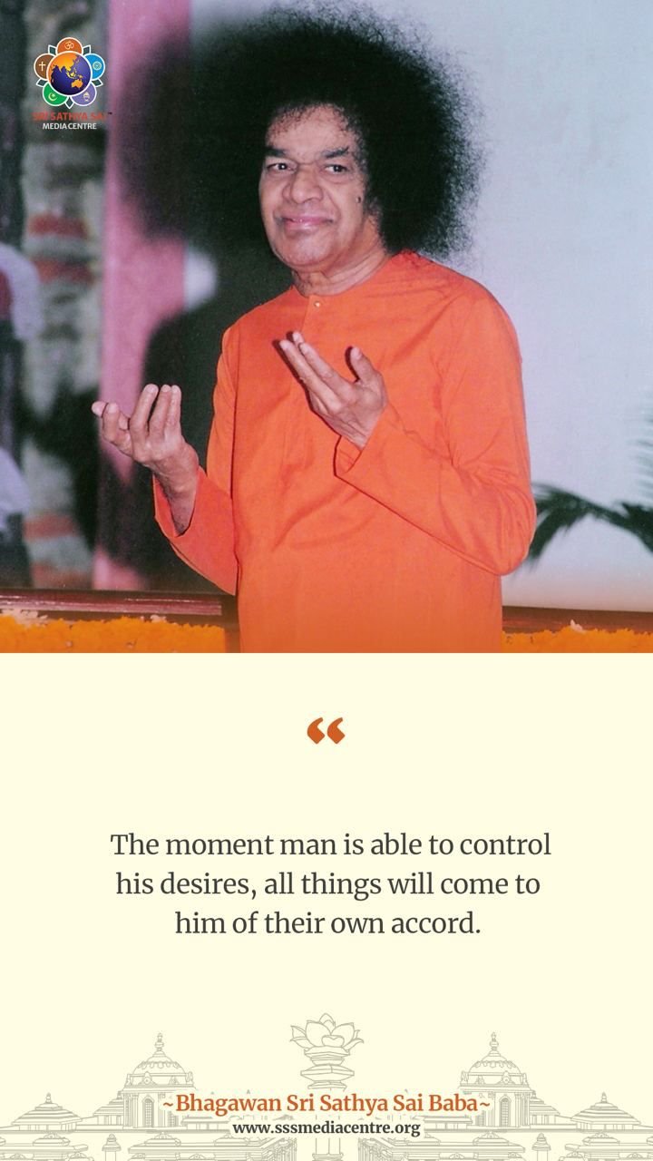 One always seeks happiness by trying to satisfy one’s desires. If a desire is fulfilled, one feels joy, and when it is not, one feels grief. But the trouble is, desire is a bonfire that burns with greater fury, asking for more fuel. One desire leads to ten, and one exhausts oneself in trying to exhaust the demands of desire. One has to be turned back from this path of never-ending desire to the path of inner contentment and joy. One grieves because one has developed attachment toward the unreal. One cultivates an unreasonable affection for wealth, but one is prepared to sacrifice the riches in order to save the lives of one’s children, for attachment to children is stronger than to the wealth that has been earned! One stoops so low as to neglect the children when the choice is between survival and the children’s welfare! But the bliss that one gets when one dwells on the Atma which is the source and spring of all joy, is unbounded and imperishable. That is the real joy.