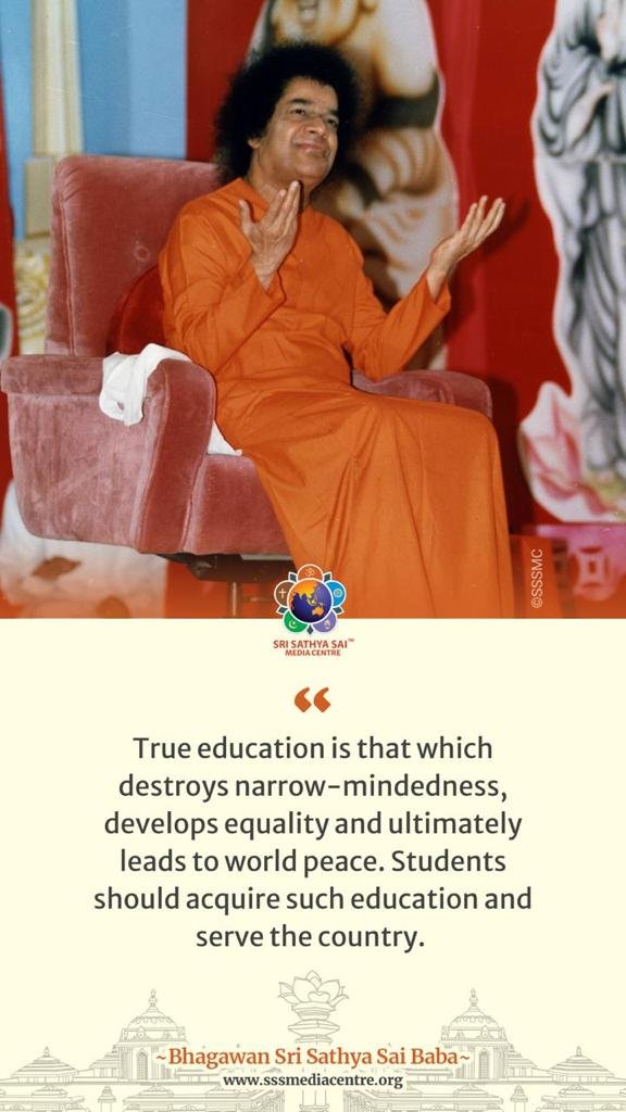 True education is that which destroys narrow-mindedness, develops equality and ultimately leads to world peace. Students should acquire such education and serve the country. – BABA