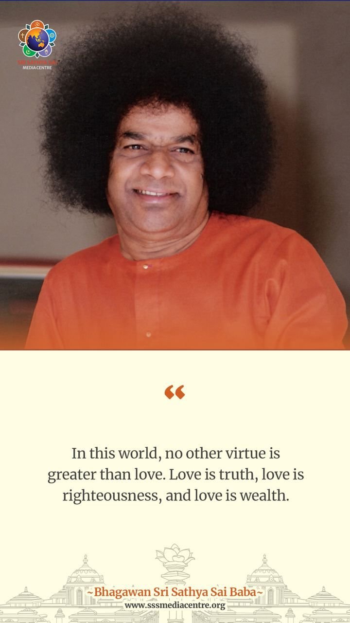 I have not come to you to “lecture”, for I do not believe in the value of mere words, however scholarly or pompous or profuse. I have come only to share with you My Prema (Love) and partake in turn of your prema. Today, the typhoon of hatred and falsehood is scattering the clouds of virtue, justice, and truth to the far corners of the sky, and people feel that Sanatana Dharma itself is in danger of extinction. But that can happen only if the Lord wills, and the Lord who has laid down dharma will not allow it to be destroyed. Wherever truth, right conduct, peace, and love are emphasised, in whatever religion or language, by whichever teacher, wherever the teacher may be, there we have Sanatana Dharma. As long as man is capable of prema, dharma (righteousness) will exist, do not doubt it. When that prema is fixed on the Lord, your mental make-up will slowly and steadily undergo a revolutionary change; then, man will share in the sorrows and joys of his fellow beings. Thereafter, he contacts the very source of the bliss, which is beyond the temporary gains and losses of this world.