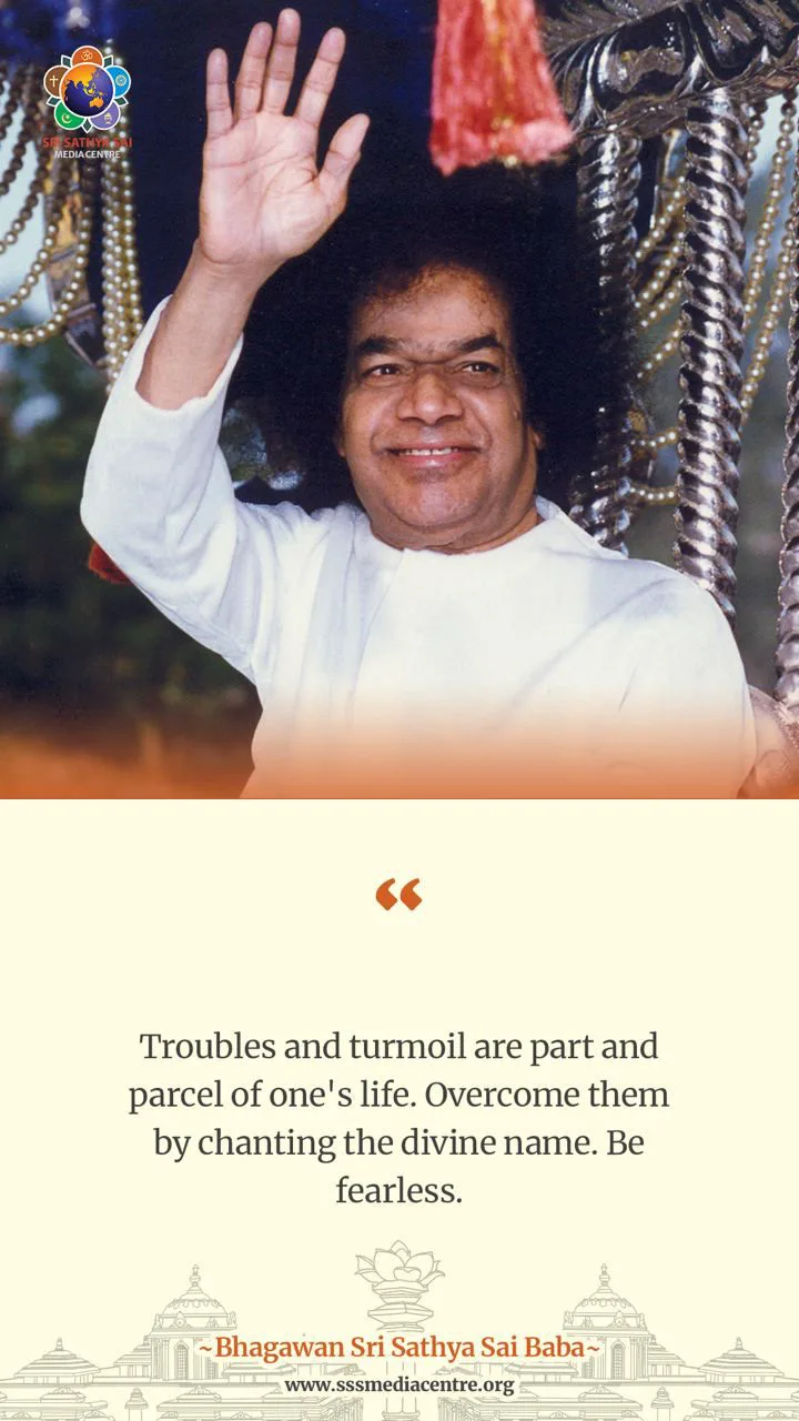 Courage is the tonic for getting both physical as well as mental health and strength. Give up doubt, hesitation, and fear. Do not give any chance for these to strike root in your mind. People can achieve anything – they can even become Madhava (God), by means of the inner divine strength, with which they are equipped. To help you to give up fear and doubt, keep the Name of the Lord always on your tongue and in your mind. Dwell on the endless forms of the Lord and His limitless Glory, while you repeat the Name. Attach yourself to Him; then your attachment for these temporary objects will fall off; or at least, you will start seeing them in their proper proportion as having only relative reality. When the tiny little ego assumes enormous importance, it causes all this bother! That is the root of all the travails!