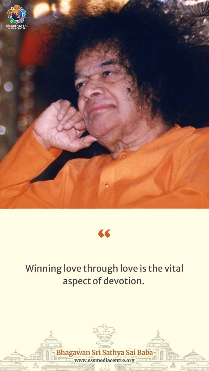 Prema (love) must transform all relationships: social, economic, educational, professional, family, religious, legal, and others. The father must love the child a little more intensely and intelligently; mother must spread love to all who come within her influence; children must love servants. The sense of equality that everyone is the repository of the divine essence must transmute social and individual behaviour! You can call Me “Embodiment of Divine Love” (Premaswarupa)! You will not be wrong! Prema is the wealth that I have and I scatter it amongst the miserable and afflicted. I have no other riches. The Grace of the Lord is always flowing like the electric current through the wire. Fix a bulb, and current to the extent of the wattage, will illumine your home! The bulb is the spiritual exercises you perform; the home is your heart. Come to Me gladly; dive into the sea and discover its depth; there is no use dipping near the shore and swearing that the sea is shallow and has no pearls. Dive deep and you will secure your desire!