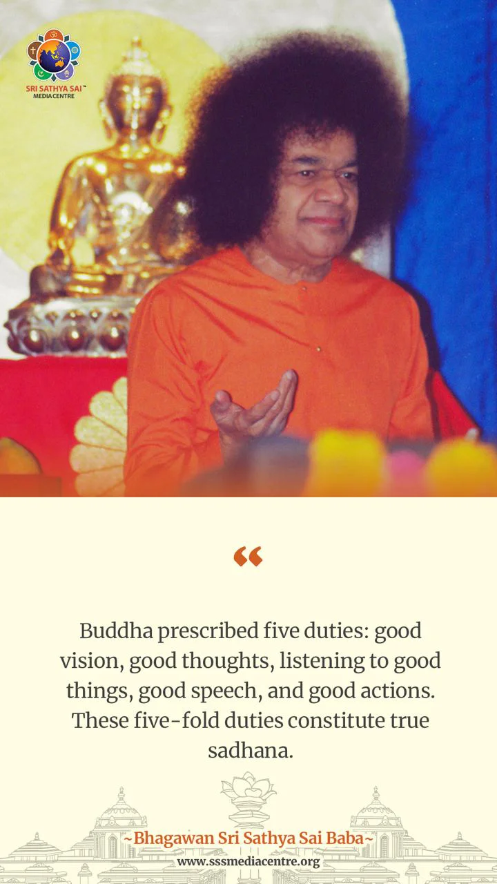 Buddha prescribed five duties: good vision, good thoughts, listening to good things, good speech, and good actions. These five-fold duties constitute true sadhana. – BABA