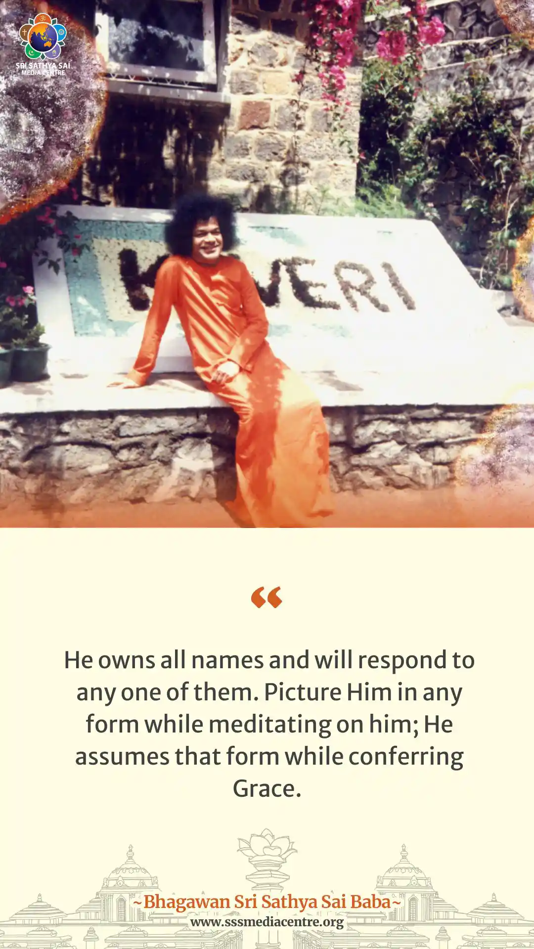 A person who claims to have gone to the seashore and played with the waves must produce, as evidence, at least a pair of wet feet, isn’t it? So too, when you come to this sea of Satsanga (the company of the pious) and share the waves of bliss, the proof is in the eye becoming wet with weeping; in the heart that exults when another is happy. Even when you listen, gather the honey as the bee does when it visits the flowers. It was said that the world is becoming Sai-mayam (full of Sai), with the Sai-namam (name of Sai) on everyone’s lips. I want it to go deeper. I also don’t insist that it should be the name “Sai”. The world must become Paramatma-mayam (full of the Supreme), with any of the many names and forms of the Supreme on the lips of people and before their minds! It’s the same substance poured into different moulds. Like sugar dolls that children seek, cats, dogs, cows and horses, all are of the self-same sweetness; one child prefers this shape and this name; another one weeps for another doll! The same Divine being appears in different times and places, assuming different Names.