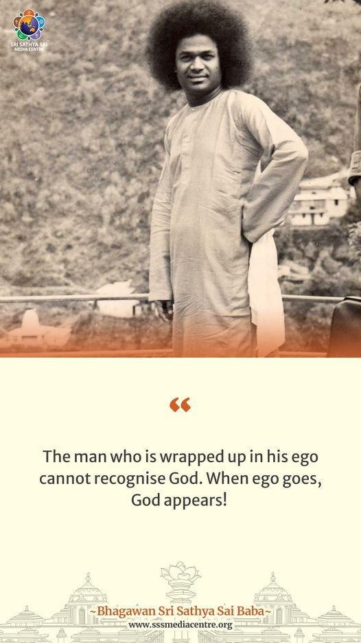 So long as you have a trace of ego in you, you cannot see the Lord clearly. That is the curtain which Saint Tyagaraja prayed to Lord Venkateshwara to remove from his mind. Egoism will be destroyed if you constantly tell yourself, ‘It is He, not I’, ‘He is the force; I am but the instrument’. Keep His Name always on the tongue; contemplate His glory whenever you see or hear anything beautiful or grand; see in everyone the Lord Himself moving in that form. Do not talk evil of others, see only good in them. Welcome every chance to help others, to console others, and to encourage others along the spiritual path. Be humble, do not become proud of your wealth, status, authority, learning or caste. Dedicate all your physical possessions and mental skills and intellectual attainments to the service of the Lord and to the Lord’s manifold manifestations.