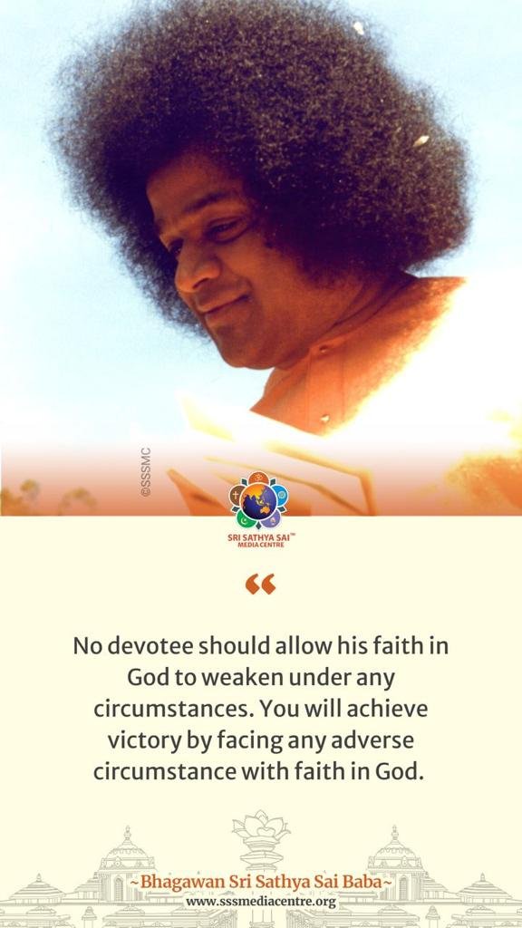 No devotee should allow his faith in God to weaken under any circumstances. You will achieve victory by facing any adverse circumstance with faith in God. – BABA