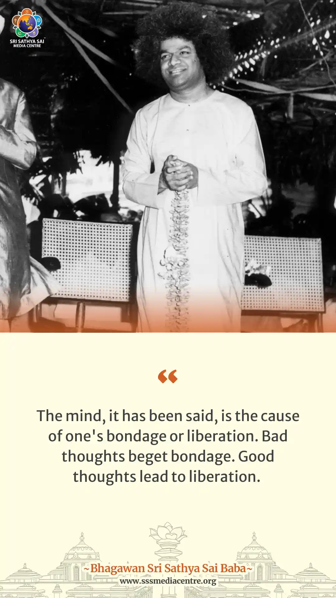 If man yields to the mind and its vagaries, and the mind is enslaved by the senses and their fancies, man cannot escape calamity. The mind prompts man to seek happiness, and avoid misery; it creates the distinction and deludes the activity; it pushes forward and pulls back, tossing man back and forth, throughout his life. The idea of happiness, which is often only another form of comfort, arises in the mind and gets concretised as objects shaped by the hands and brains of man like the aeroplane, the radio, and even the bomb that devastates and delights the mind saturated with hate. Ideas, desires, cravings, yearnings – these get actualised and so, the world is only the product of the mind. In fact, the Universe is itself the manifestation of the Divine Mind, which willed, Ekoham bahusyam: “I am one, let Me become many!” The Universe arose in the mind of God, it sprouted and spread there, and since then, the mind has become potent and permeating. For each of you, it is the mind that colours the world. If it is pure, the world is congenial; if it is unclean, the world is replete with jeopardy.